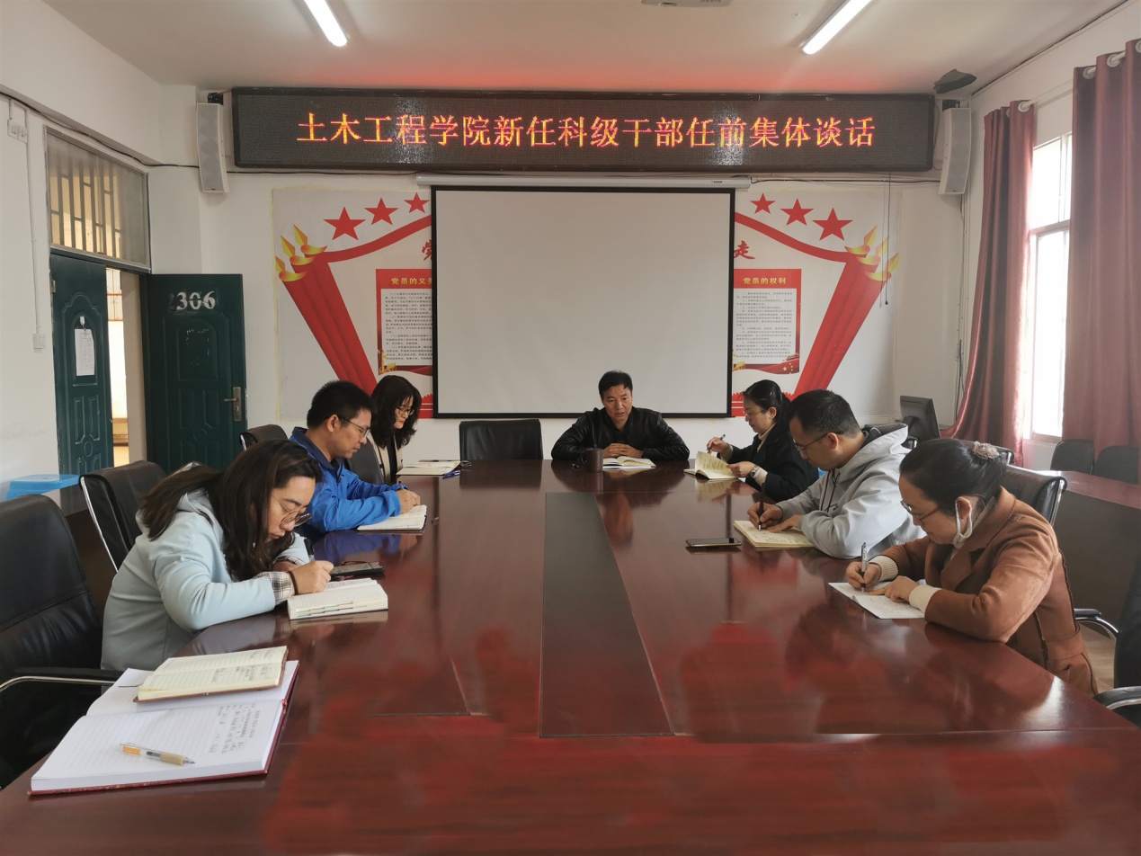 3月8日上午公司党委在土木楼306组织新任科级干部进行任前集体谈话。公司党委书记谭泽飞、副经理孙微微、副书记李贵兰、副经理王秋华,新任科级干部吴跃红、崔飞、芮蕊参加会议。