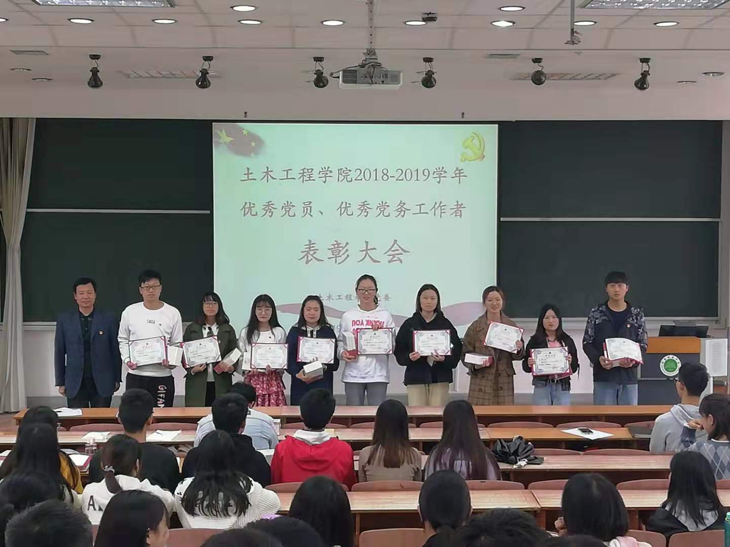 为深入推动“不忘初心、牢记使命”主题教育,引导和激励广大党员同志奋发进取,11月11日下午四点,公司党委在三教阶梯教室303举行2018-2019学年优秀共产党员、优秀党务工作者表彰大会,大会由党委书记谭泽飞同志主持,全体师生党员同志参加大会。